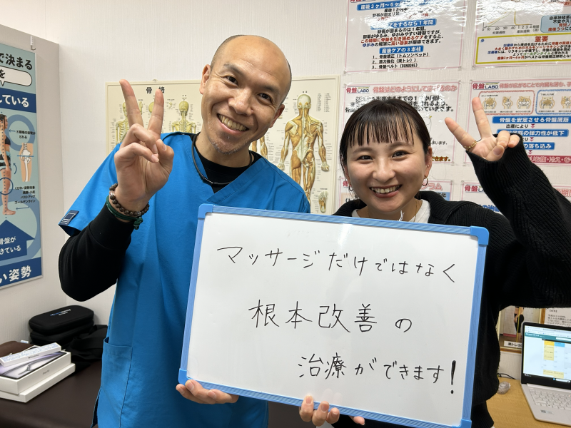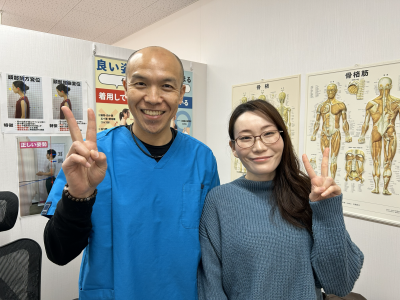 Q: 同じ症状でお悩みの方に向けて、メッセージをお願いします。 A: 先生方もとても優しく、分かりやすい説明と丁寧な治療をして下さり、こちらに来て本当に良かったです。体のことで困ったことがあれば、とてもオススメの整骨院です。